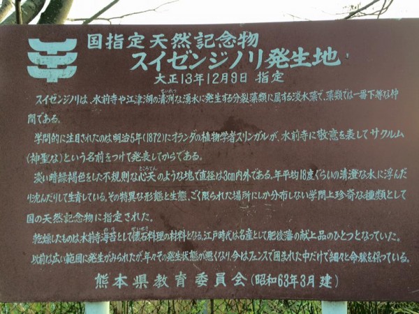 熊本市の江津湖に「スイゼンジノリ発生地」という金網フェンスで囲まれた一角があります。立て札を読むとかつて天然記念物であるスイゼンジノリが生息していた場所であることが分かりますが、昭和28年の水害で全滅し、その後場所だけがフェンスで守られ、平成20年にはコンクリートパネルで特別保護区が設け られ現在に至っていることが分かります。いまは「経過観察中」とのこと。