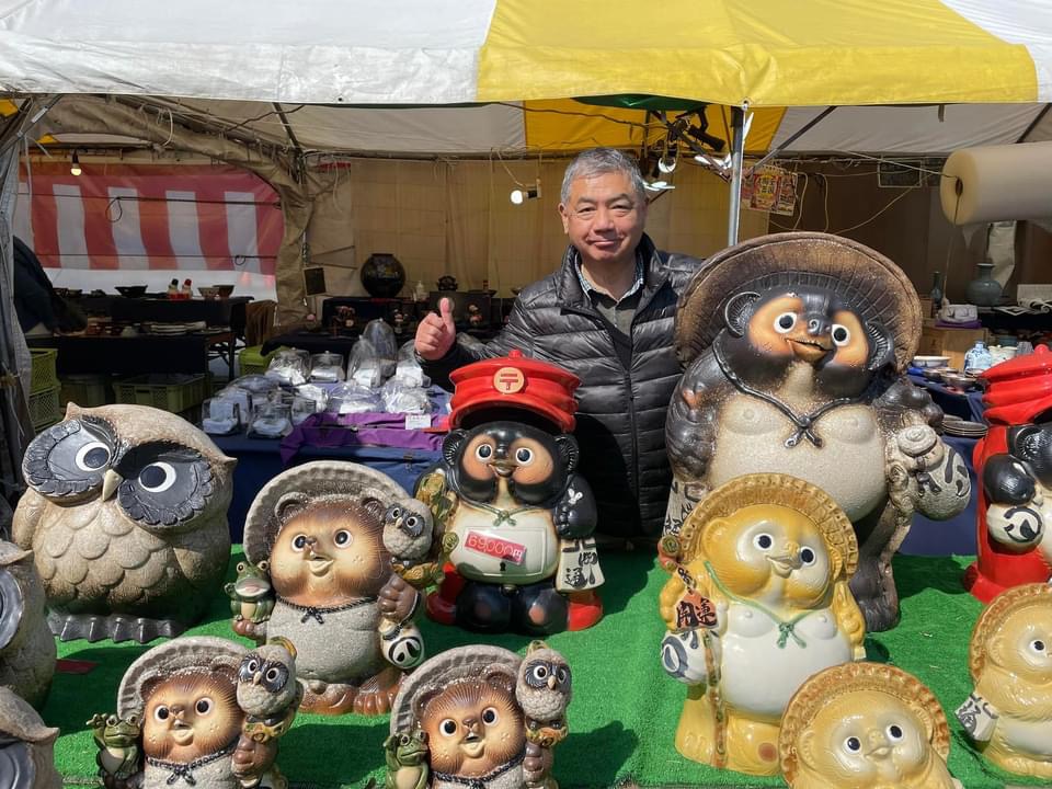 気に入った小皿を中心に買い求め、ついでに嬉野の銘茶を買い、最後は信楽のタヌキと記念ショット撮りました。