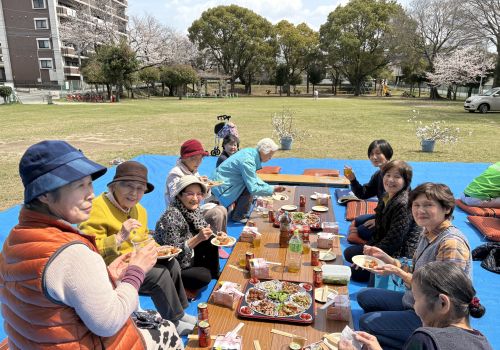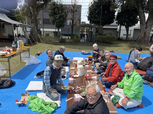 公園愛護会の皆さんのお陰で、きれいな公園のど真ん中で絵に描いたような花見を楽しみました。よく食べ、よく飲み、よく笑い。やっぱり花より団子です。