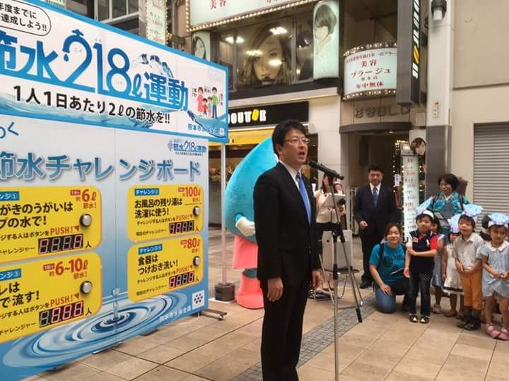 今日は市役所の呼びかけで「節水218運動」に参加しました。218というのは熊本市民の一日「水」使用料を九州主要都市の平均値218リットルまで抑えようというもの。水道水の全てを地下水で賄う熊本市民はやはり水の使い方が激しいんでしょうね。市長、議長、水道局、環境局の主要メンバーに幼稚園の園児とゆるキャラ「節水ちゃん」が加わり豪華なパレードとなりました。それにしても218の年間数値目標を与えられても、なかなか個人で意識して達成するのは難しい気がします。将来は消費した水の量が顔の上に表示されるような装置を・・。取り敢えず汗だくで帰って、今日のシャワーだけは我慢することにしました。