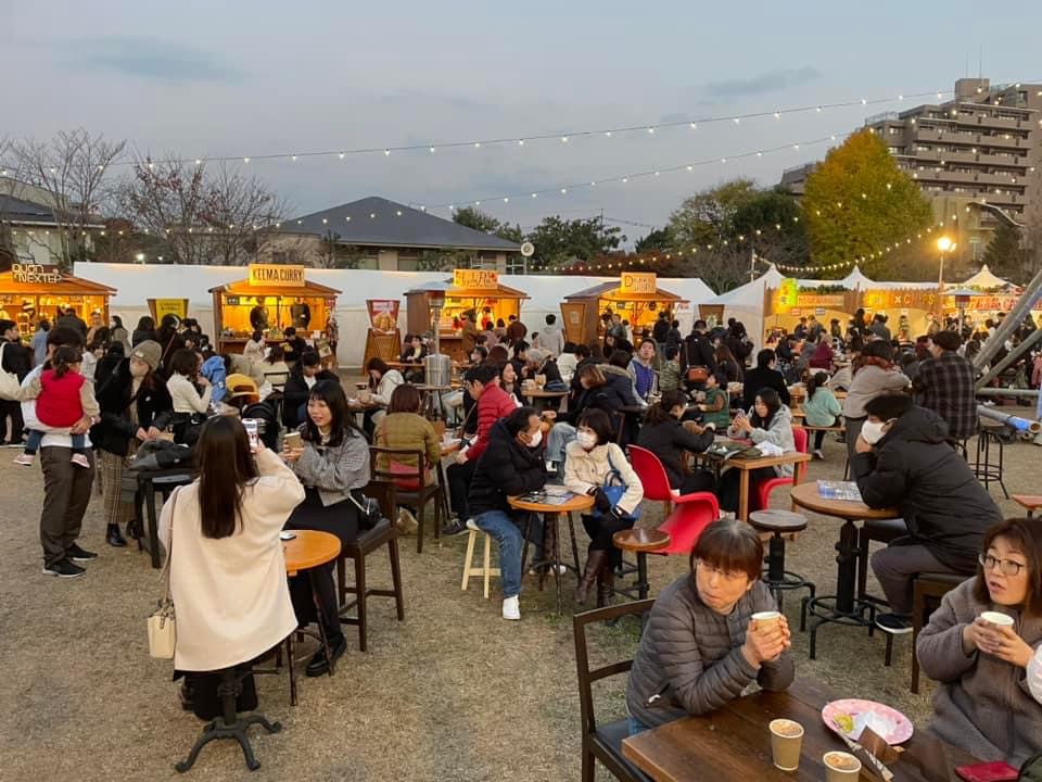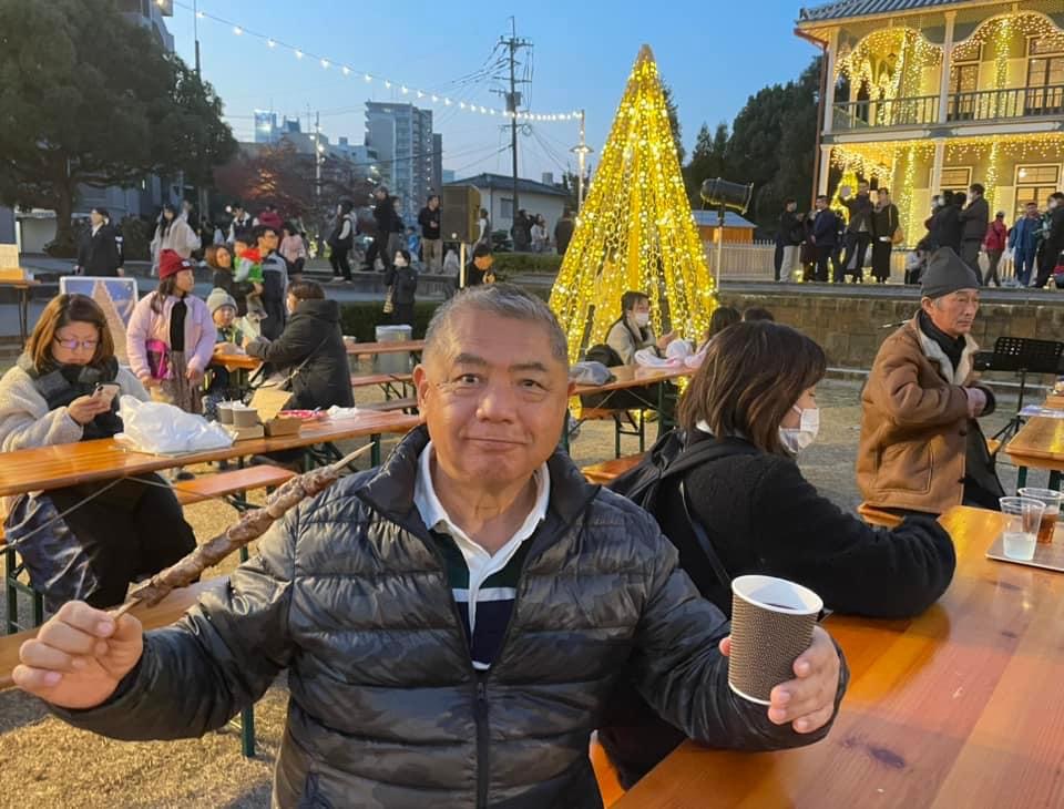 本来はクリスマスまで切れ目のないものですが、取り敢えず今日はカルビ串焼きをグリューワイン(ホットワイン)でいただきました。花博で使った竹製ブランコも大活躍で、今回の試みに関わった全ての方に賛辞を贈りたいと思います。